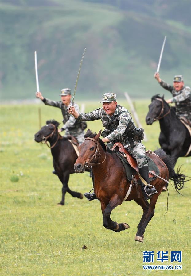 西部战区陆军某旅玉树独立骑兵连连长尼都塔生(中)带领全连官兵进行战术训练(7月6日摄)。 新华社记者 张永进 摄