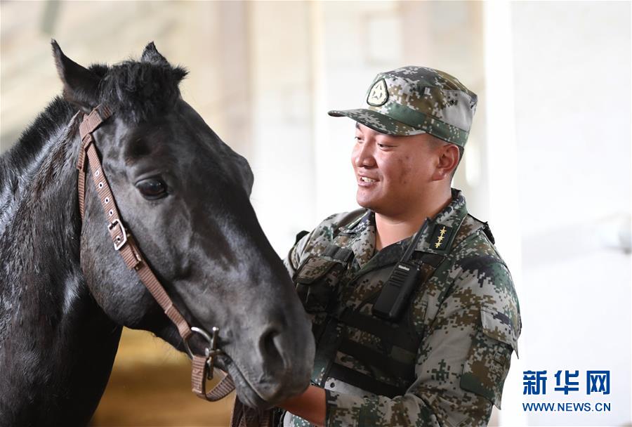 西部战区陆军某旅玉树独立骑兵连连长尼都塔生与“无言的战友”亲切交谈(7月6日摄)。 新华社记者 张永进 摄