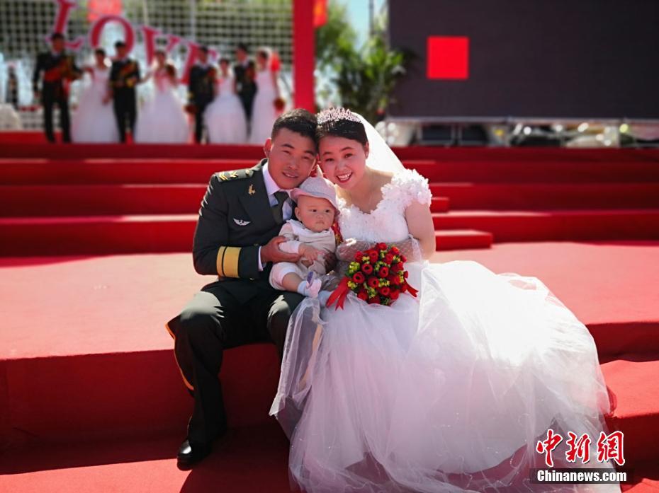 婚礼仪式结束后,新人们留恋在现场,自拍“秀恩爱”,与家人朋友、战友合影,分享他们的幸福。丁思 摄