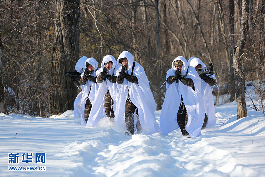 李玉峰(前)组织官兵在冰天雪地中演练突击队形(2019年3月7日摄)。 新华社发(关国路 摄)