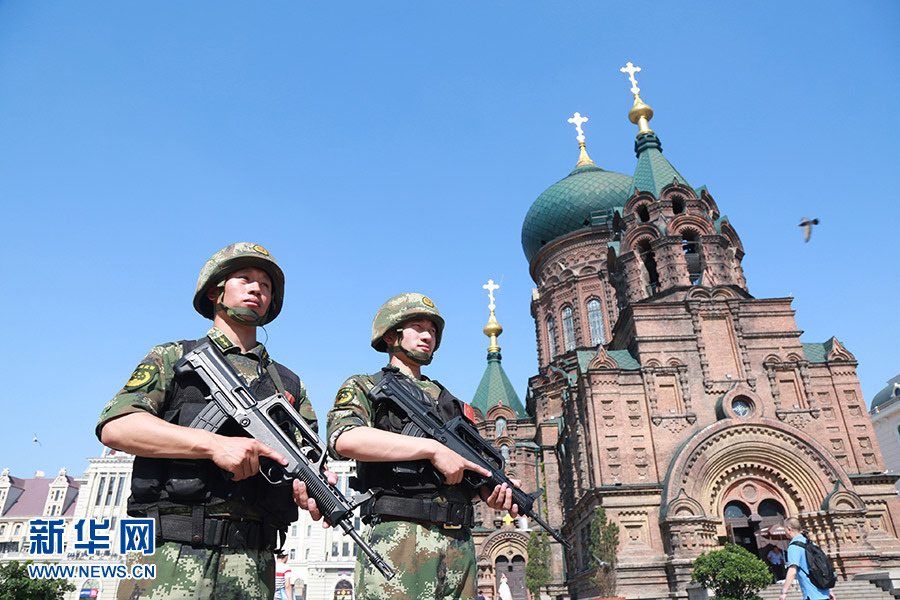 李玉峰(左)在哈尔滨执行武装巡逻任务(2015年7月7日摄)。 新华社发(郝宽虎 摄)