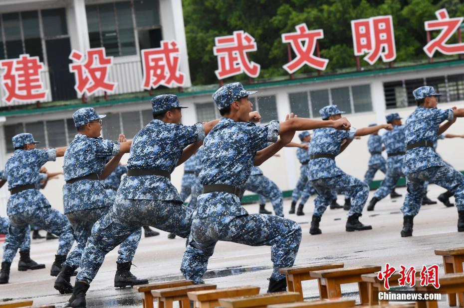 7月28日,学员岳家拳表演。当天,300名青少年穿着齐整的迷彩服集合在香港新围军营的操场上。学员们昂首挺胸列队进场,在庄严的升国旗仪式之后他们进行了岳家拳表演,用整齐的队形、熟练的动作、高昂的气势,向在场嘉宾和家长们展示过去半个月的训练成果。此届军事夏令营中,青少年营员们接受了体能训练、单个军人队列动作、战备基础、激光模拟对抗和地图使用等多项军事课目训练,参加了徒步行军、专题讲座、学唱歌曲、观看《致敬祖国》综艺演出等活动,分别赴昂船洲军营和石岗军营参观见学,度过了短暂而又充实的军营时光。中新社记者 李志华 摄