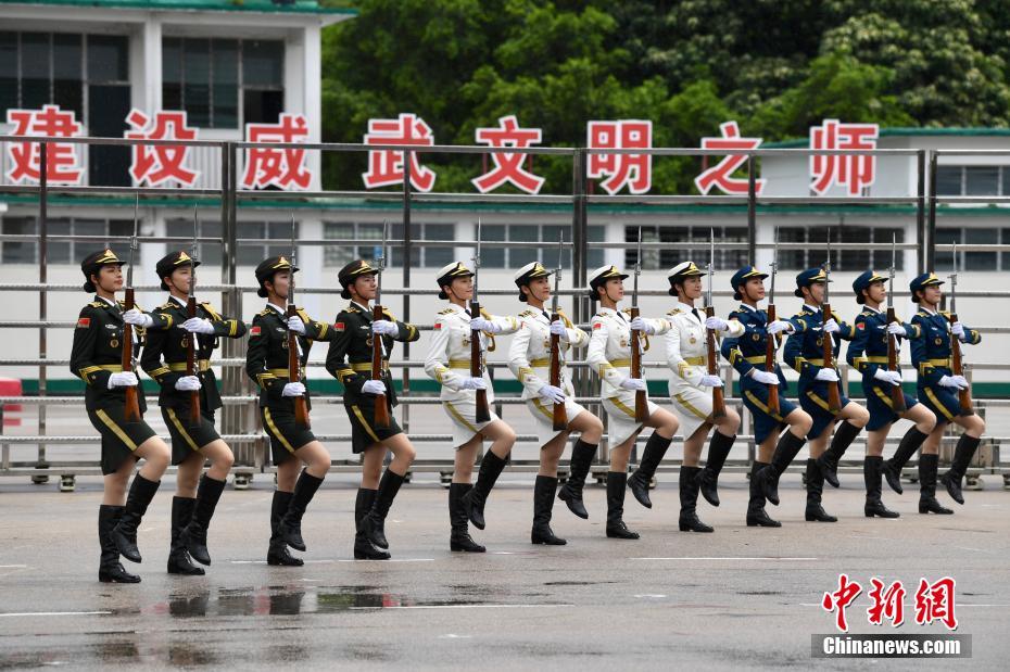 7月28日,驻港部队三军仪仗队精彩的枪操表演。当天,300名青少年穿着齐整的迷彩服集合在香港新围军营的操场上。学员们昂首挺胸列队进场,在庄严的升国旗仪式之后他们进行了岳家拳表演,用整齐的队形、熟练的动作、高昂的气势,向在场嘉宾和家长们展示过去半个月的训练成果。中新社记者 李志华 摄