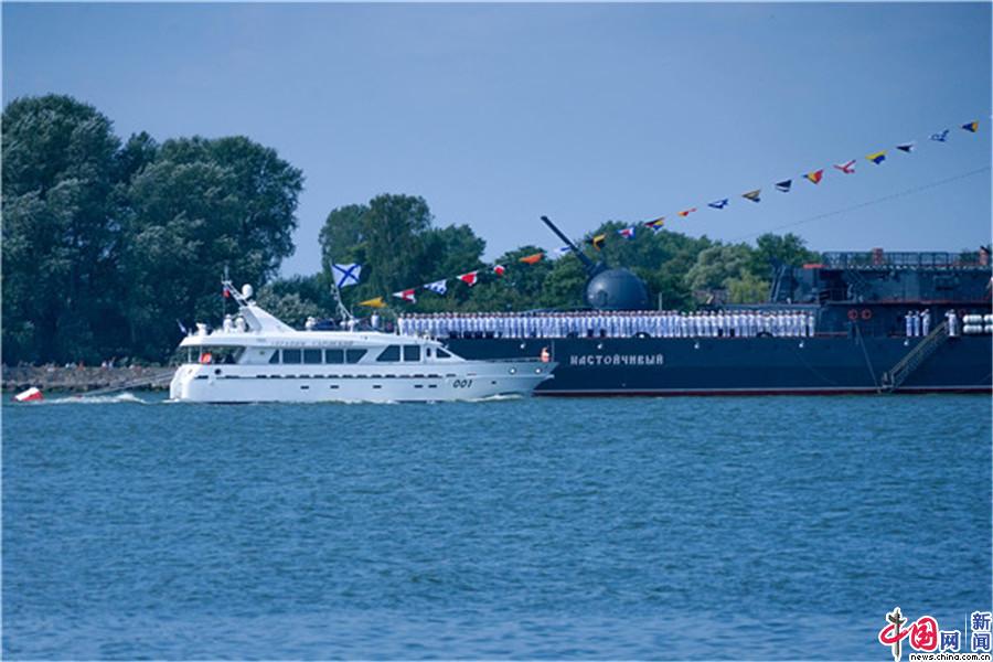 波罗的海舰队司令乘快艇检阅“坚持”号导弹驱逐舰。 吴浩宇 摄