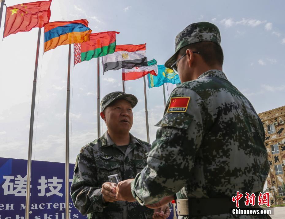 7月28日,赛事主办方向中方参赛队员赠送纪念章。当日,参加“国际军事比赛—2019”的中国陆军参赛队员举行入营仪式。今年中国陆军承办的“国际军事比赛—2019”将于8月3日在新疆库尔勒拉开战幕。这是自2017年以来中国陆军第3次在这里承办赛事。今年库尔勒赛区举行“苏沃洛夫突击”步战车车组、“晴空”便携式防空导弹班组、“安全环境”核生化侦察组和“军械能手”武器修理班组 4项比赛,目前,赛事各项工作已准备就绪。中新社记者 刘晓东 摄
