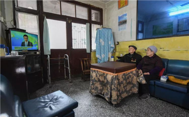 张富清和老伴在住了几十年的老房子里看电视(3月31日摄)。新华社记者 程敏 摄