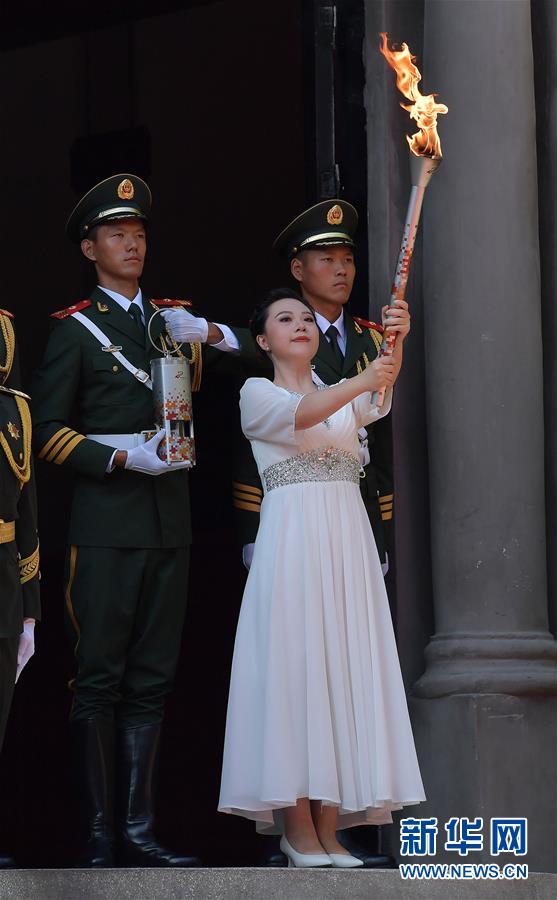 8月1日,采火使者方铭璐点燃采火棒后准备采集圣火火种。 当日,第七届世界军人运动会圣火火种采集和火炬传递启动仪式在江西省南昌市举行。 新华社记者彭昭之摄