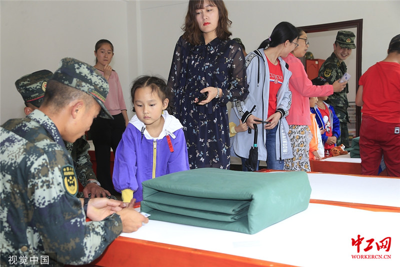 2019年8月1日,驻藏武警某部交通第三支队邀请来队探亲军属游军营共庆建军节活动,官兵示范叠军被。