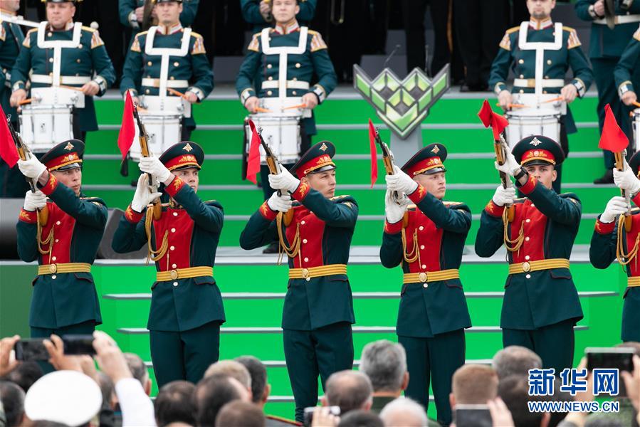 8月3日,在俄罗斯莫斯科郊外的爱国者公园,仪仗队在“国际军事比赛-2019”开幕式上表演。新华社记者 白雪骐 摄