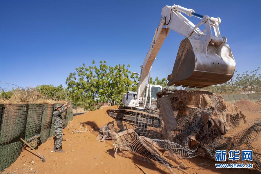 7月10日,在苏丹北达尔富尔州法希尔,中国工兵在修建超级营地外围防御设施时拆除营区周边老旧工事。新华社发