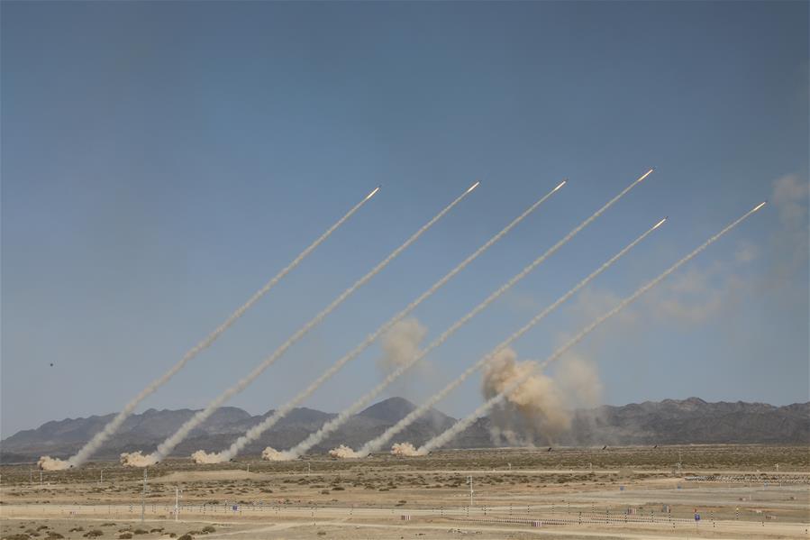 8月3日,在军事课目演示中,某型火箭炮实施火力打击。新华社发(王军强 摄)
