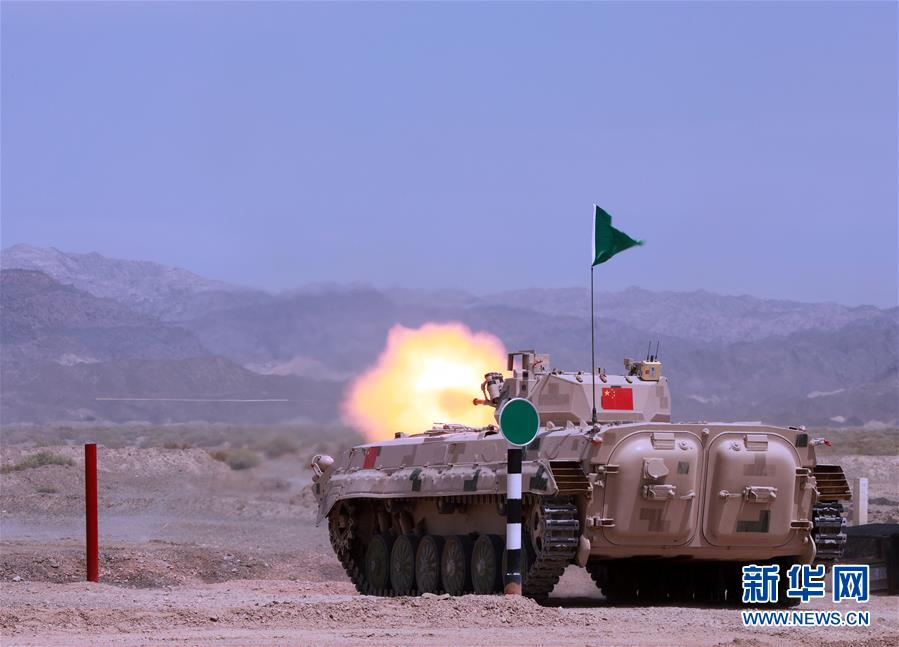 8月4日,参赛步战车进行实弹射击。 当日,“国际军事比赛-2019”“苏沃洛夫突击”步战车组单车赛第一小组赛在中国新疆库尔勒赛区举行。中国、伊朗、津巴布韦3国参赛队9个车组角逐赛场,中国参赛队以16分12秒95的成绩刷新该项目纪录。 新华社发(王军强 摄)
