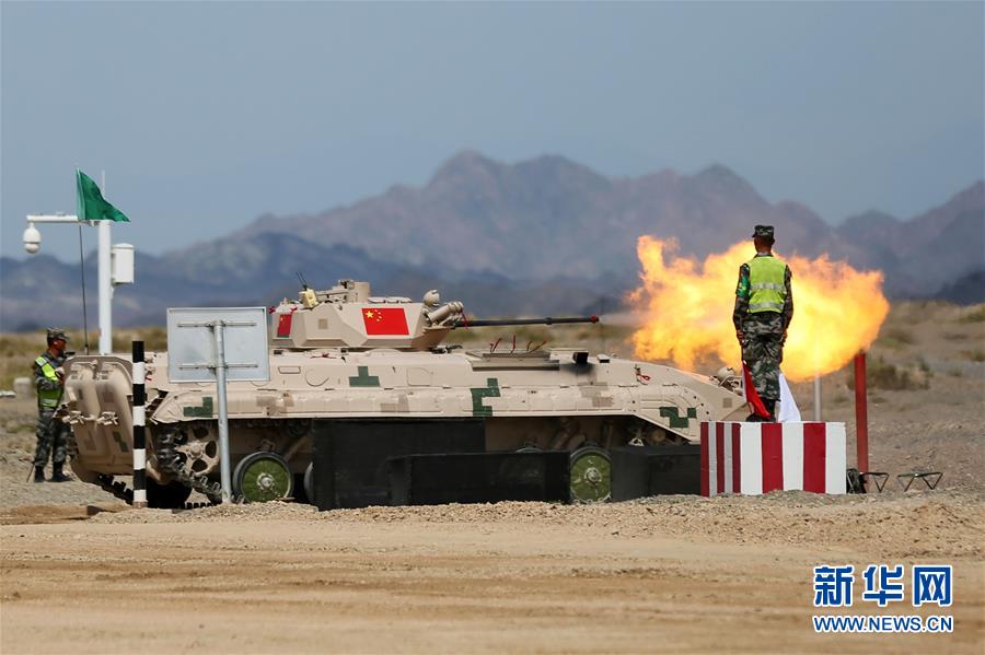 8月4日,中国参赛步战车进行射击。 当日,“国际军事比赛-2019”“苏沃洛夫突击”步战车组单车赛第一小组赛在中国新疆库尔勒赛区举行。中国、伊朗、津巴布韦3国参赛队9个车组角逐赛场,中国参赛队以16分12秒95的成绩刷新该项目纪录。 新华社发(赵治国 摄)