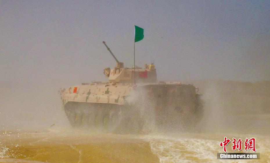 8月4日,中国陆军承办的“国际军事比赛-2019”在库尔勒赛区举行,比赛第一天迎来“苏沃洛夫突击”步战车单车赛第一小组赛。中国、津巴布韦、伊朗三国间展开激烈角逐。最终,中国队二组队员拿到最好成绩,并打破“苏沃洛夫突击”步战车组单车赛记录。图为中国队步战车迅速通过障碍涉水场,如蛟龙出水。中新社记者 王小军 摄