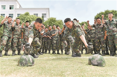 训练间隙,李保国与战士开展趣味游戏活动。