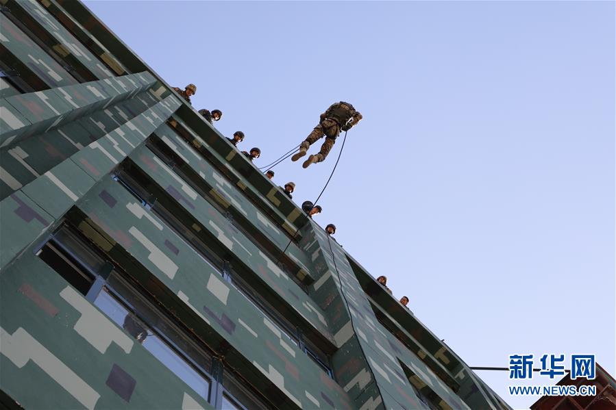 8月7日,吉方参演官兵进行单环节跳下训练。 当日,中吉“合作-2019”联合反恐演练开展联合训练,中吉双方参演官兵进行了特战攀岩、模拟直升机索降等训练课目。 新华社记者 刘芳 摄