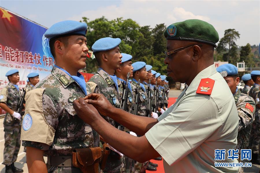 8月8日,在刚果(金)布卡武市“中国半岛”营区,嘉宾代表为中国第22批赴刚果(金)维和部队官兵授勋。新华社发(李志强 摄)