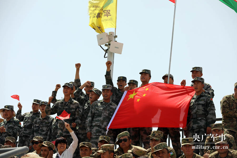 新疆军区某师官兵来到比赛现场,为中国参赛队加油呐喊。 王军强 摄
