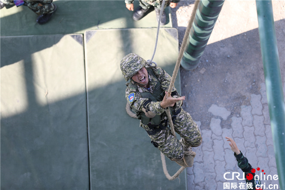 吉方参演官兵正在训练“楼房攀登抓绳上”这一课目(图片提供:赵俊杰、罗涛、田晓鹏、张曦)