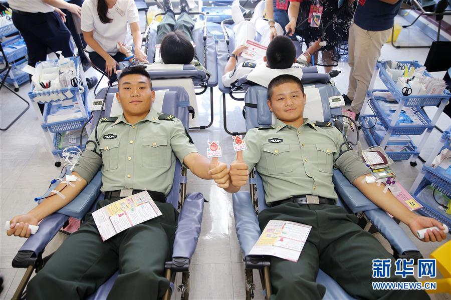 8月9日,解放军驻港部队战士在献血。新华社发(易定 摄)