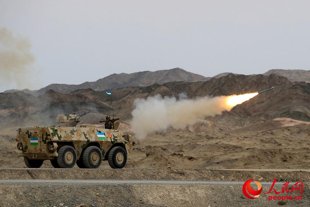 乌兹别克斯坦参赛队员使用便携式导弹进行射击。