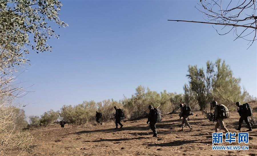 在中吉“合作-2019”联合反恐演练沙漠追剿战斗综合演练中,中吉双方特战队员混合编组进行联合搜剿(8月11日摄)。 新华社记者 刘芳 摄