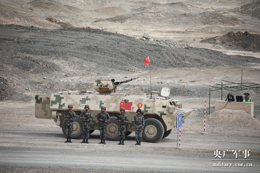 中国参赛队员驾驶战车驶向出发线。 刘梦源 摄