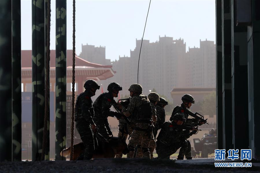 8月13日,在楼房反劫持课目演示中,中吉双方混编小组展开搜索行动。 新华社发(田晓鹏 摄)