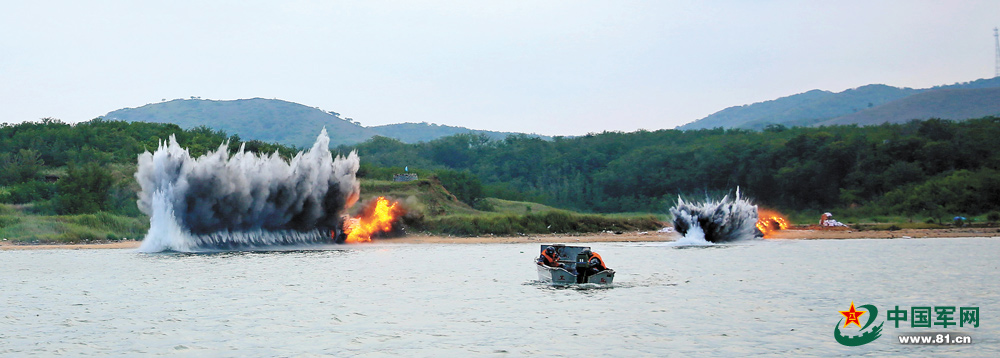 8月上中旬,海军陆战队某旅组织开辟水上通路训练。 热浪滚滚,暑气蒸腾。