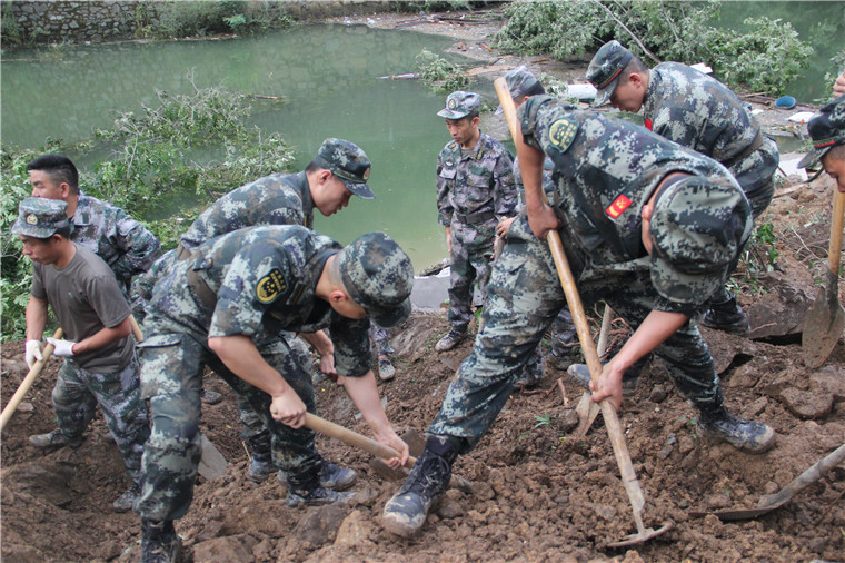 8月14日,在山体滑坡救援现场,武警重庆总队执勤第三支队城口中队官兵正在展开救援工作。李春阳 摄