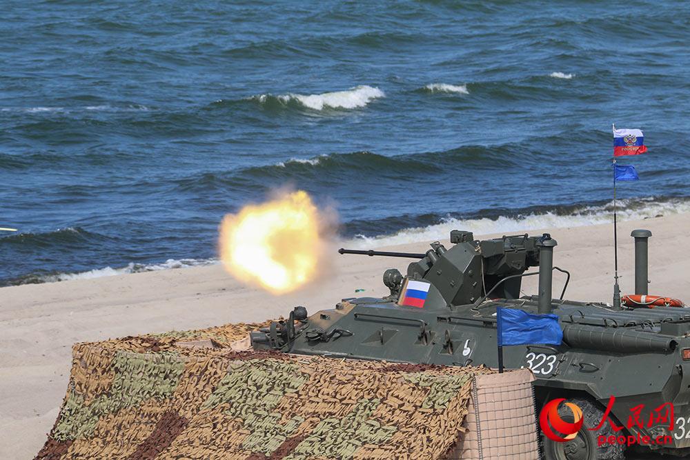 俄罗斯参赛车组正在使用30毫米车载自动炮对海上目标射击。