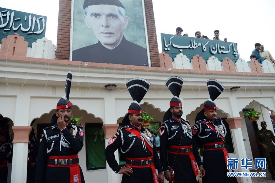 8月14日,在巴基斯坦东部边境的瓦格赫口岸,巴基斯坦仪仗兵站在国父真纳的画像前。新华社发