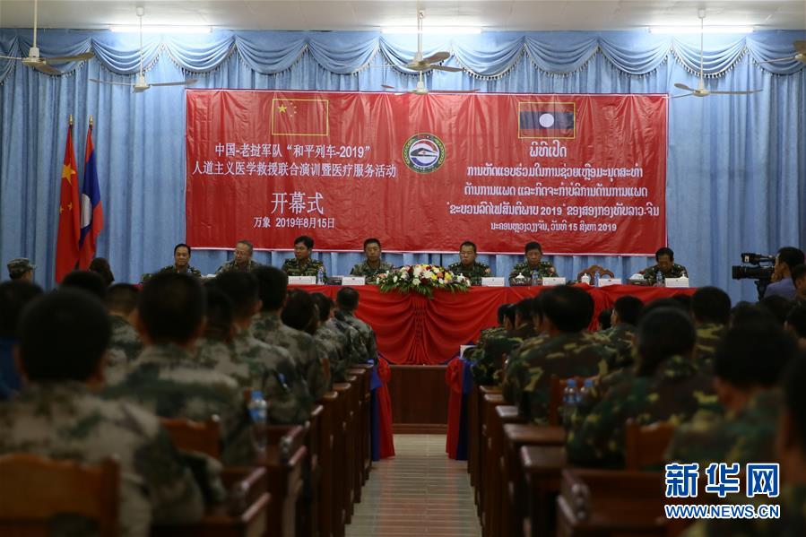 8月15日,在老挝万象,“和平列车-2019”中国-老挝军队人道主义医学救援联合演训暨医疗服务活动举行开幕式。 代号为“和平列车-2019”的中国-老挝军队人道主义医学救援联合演训活动暨医疗服务活动15日在老挝首都万象拉开帷幕。据悉,本次联演活动以泥石流灾害人道主义医学救援为主题,将持续至本月19日,两军参演官兵数量近500人。 新华社发(熊天泽摄)