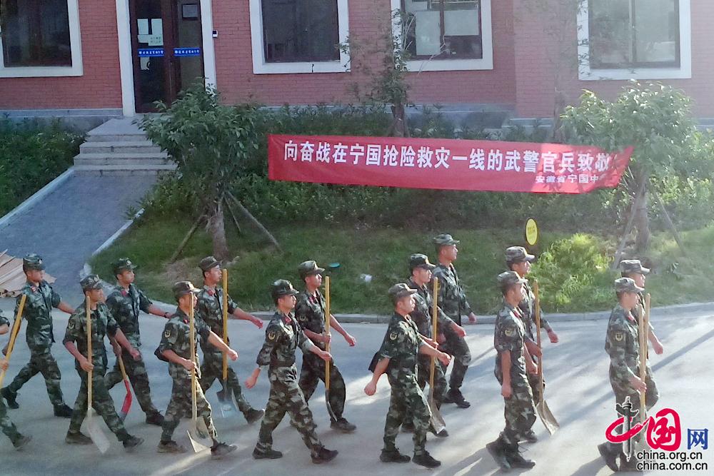 宁国中学得知已经连续奋战5天的武警官兵住在学校,连夜制作了一条横幅,挂在官兵宿舍楼的墙上。图为,迎着晨曦,武警官兵们又开始了一天紧张又忙碌的救援工作。吴鹏飞摄
