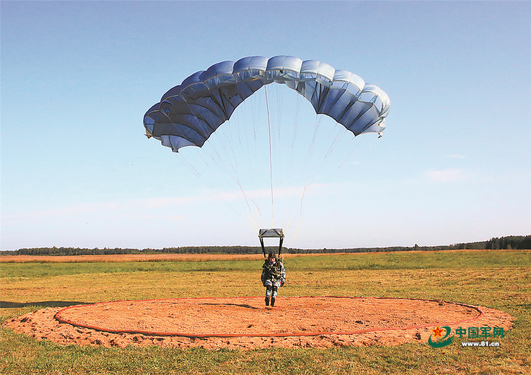 8月12日,在“空降排”项目定点跳伞课目比赛中,我军空降兵参赛队空中领队黄晓龙精准踩点。