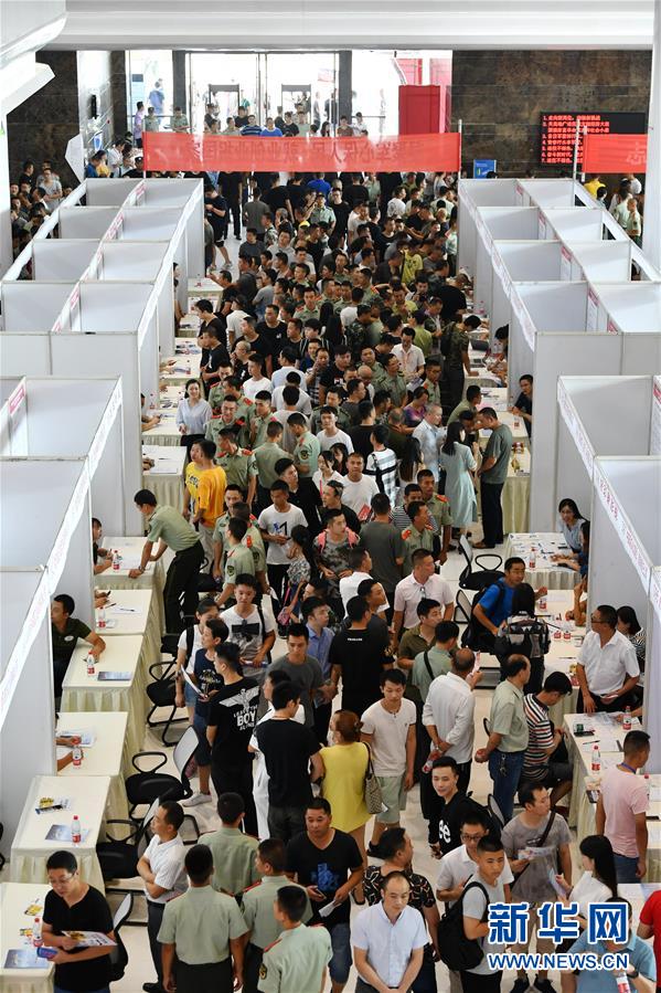 这是8月20日拍摄的退役军人专场招聘会现场。 当日,重庆市2019年退役军人就业创业活动周启动仪式暨退役军人专场招聘会在重庆市人力资源服务产业园举行,共有200多家企业进场招聘,4000多名退役军人和优抚对象入场求职。 新华社发(曹峰 摄)