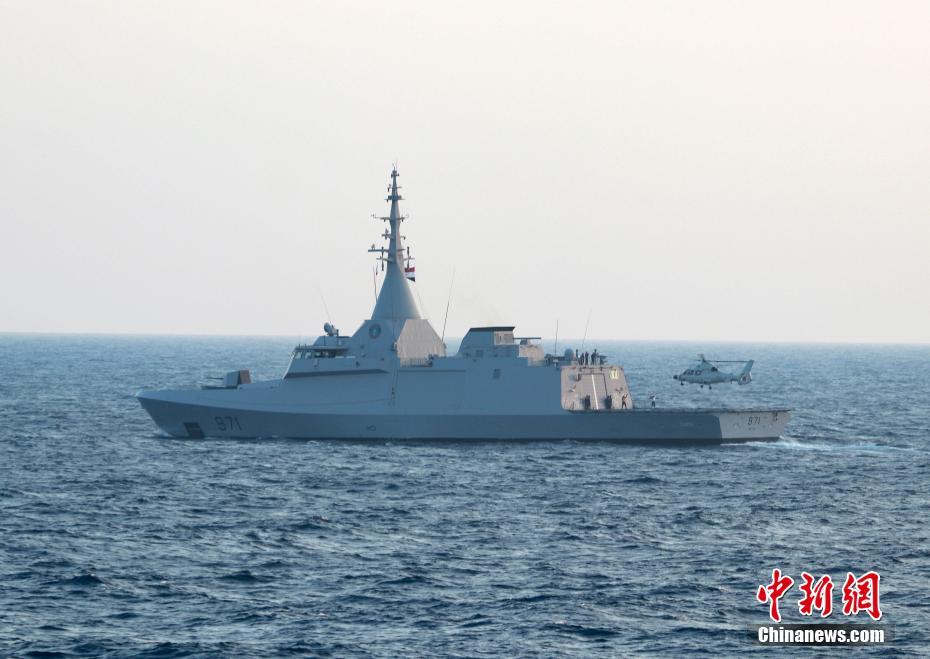 当地时间8月19日,中国海军第三十二批护航编队西安舰圆满完成为期4天的技术停靠,驶离埃及亚历山大港,并在亚历山大港以北海域与埃及海军“阿拉法特”号护卫舰举行了海上联合演练。图为中国海军西安舰舰载直升机在埃及海军“阿拉法特”号护卫舰上进行着舰训练。中新社发 钟欣 摄