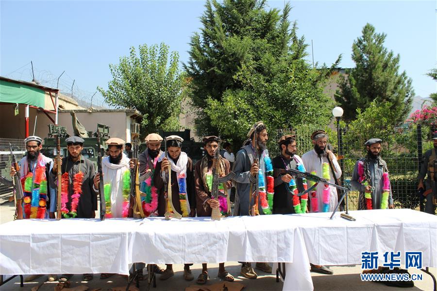 8月22日,在阿富汗东部库纳尔省首府阿萨达巴德市,前伊斯兰国武装分子参加投降仪式。 阿富汗政府官员22日说,13名伊斯兰国武装分子在阿东部库纳尔省向政府军投降。 新华社发(埃姆兰·瓦克 摄)