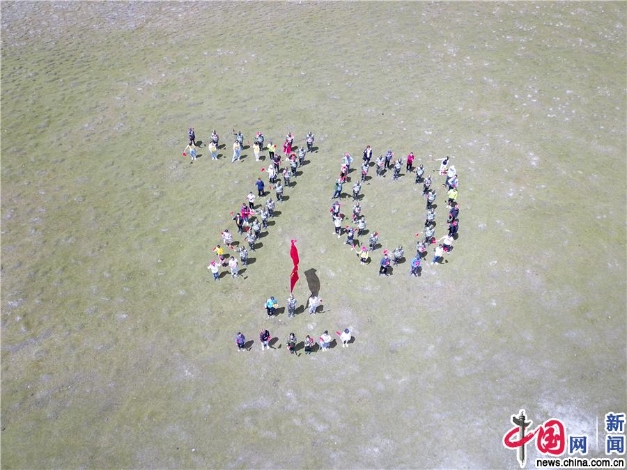 8月21日,官兵们和游客在川藏线安久拉山摆出“70”字样,迎接祖国70华诞。陆文凯 摄