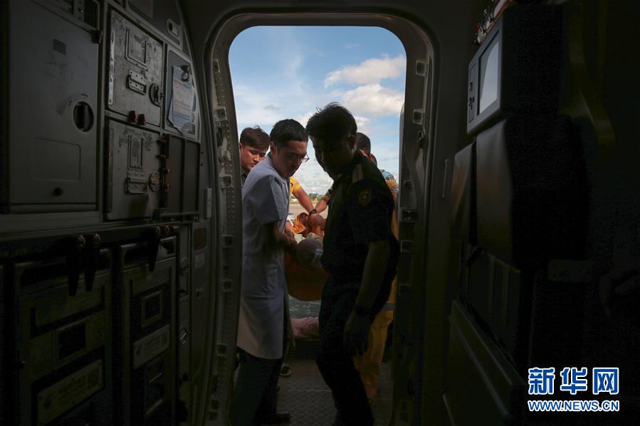 8月23日,在老挝万象,中老两军医护人员将受伤的中国游客送上飞机。新华社发(熊天泽 摄)