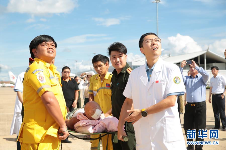 8月23日,在老挝万象,中老两军医护人员准备将受伤的中国游客送上飞机。新华社发(熊天泽 摄)