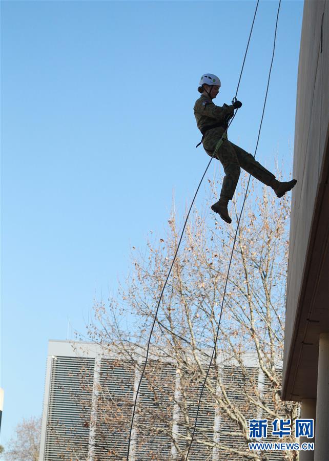 这是8月24日在澳大利亚堪培拉的澳大利亚国防学院拍摄的楼顶绳降展示。 位于澳大利亚堪培拉的澳大利亚国防学院24日举行了一年一度的开放日活动。参观者可以在活动中看到各项表演,还能获得在学院学习生活的信息。 新华社发(储晨 摄)