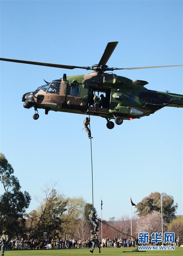 这是8月24日在澳大利亚堪培拉的澳大利亚国防学院拍摄的直升机绳降展示。 位于澳大利亚堪培拉的澳大利亚国防学院24日举行了一年一度的开放日活动。参观者可以在活动中看到各项表演,还能获得在学院学习生活的信息。 新华社发(储晨 摄)