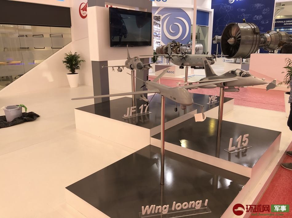 中方展出的枭龙战斗机、“猎鹰”高级教练机、“翼龙”无人机等航空装备模型。