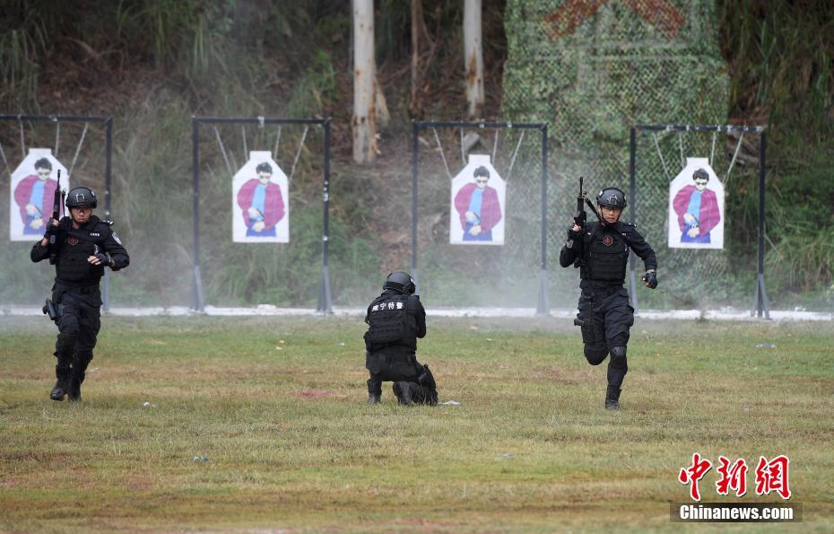 8月27日,广西公安实战大练兵演练活动在南宁市举行。全区14个地市公安特警及铁路公安特警1200余人依次进行实战射击技能展示、格斗技能与快反处置、客运大巴车辆反劫持事件处置、“空地一体”突击攻坚处置等演练科目,充分展示广西公安机关练兵成果,体现协同合作的应急处突能力。 图为特警队员展示快速射击。俞靖 摄