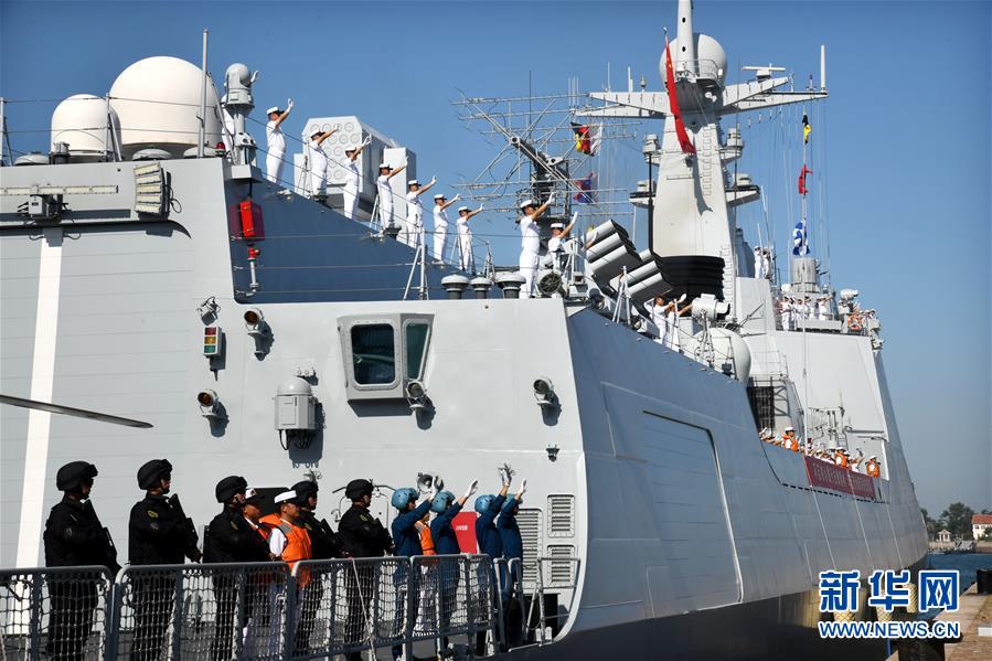 8月29日,西宁舰上,任务官兵在起航仪式上向亲友挥手道别。新华社记者 李紫恒 摄