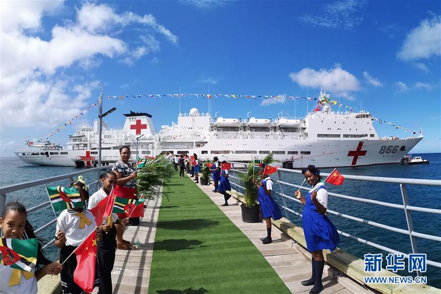 在多米尼克首都罗索,当地学生挥动多中两国国旗欢迎中国海军和平方舟医院船首次到访(2018年10月12日摄)。 新华社发(江山 摄)