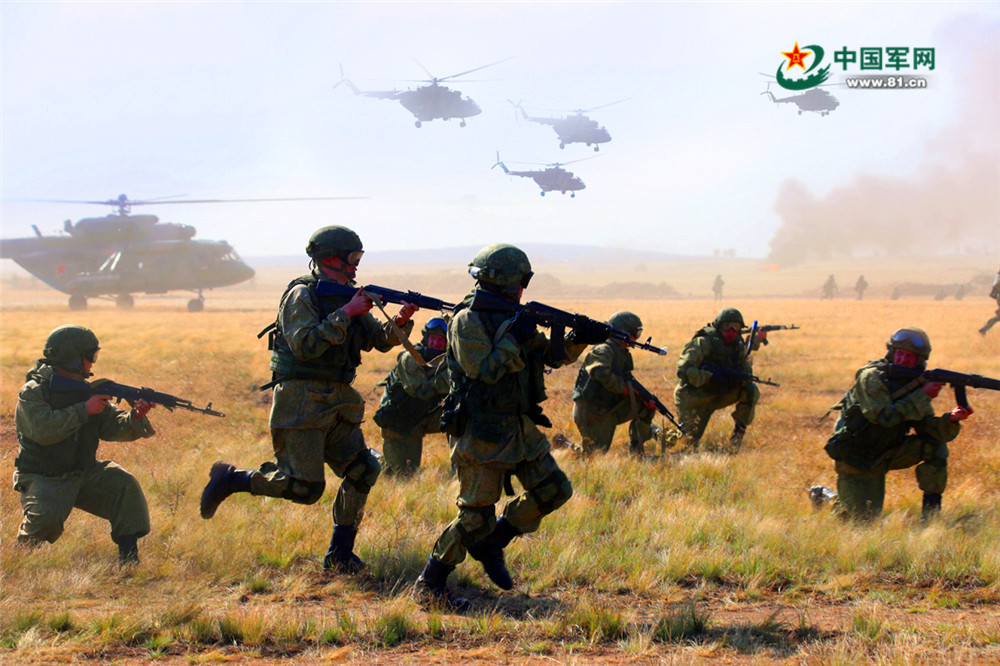 俄军特战队员在武装直升机掩护下向“敌”纵深突击。