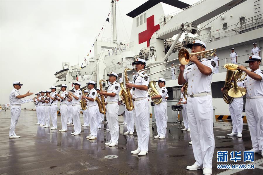 9月21日,军乐队奏乐迎接圣火到来。 当日,第七届世界军人运动会军营火炬传递在海军“和平方舟”医院船靠泊浙江舟山某军港举行。 新华社发