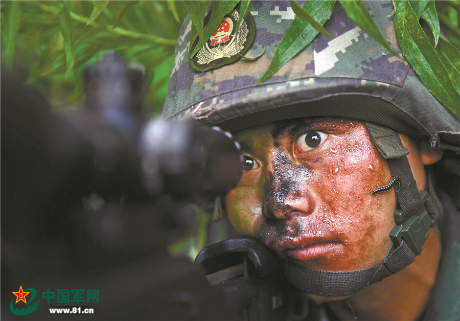 训练中,一只千足虫爬上尔只伍甲的脸颊,他却一动不动。